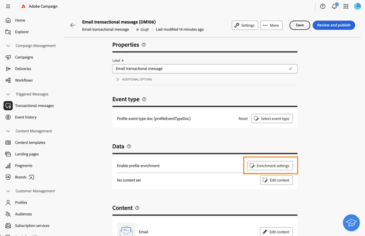 Met deze functie kunt u transactieberichten personaliseren door Adobe Campaign-databasevelden aan berichtinhoud te koppelen. U kunt doeltoewijzingen, verrijkingskolommen, en een verzoeningssleutel selecteren om nauwkeurige, real-time verpersoonlijking te verzekeren terwijl het handhaven van prestatiesdrempels.