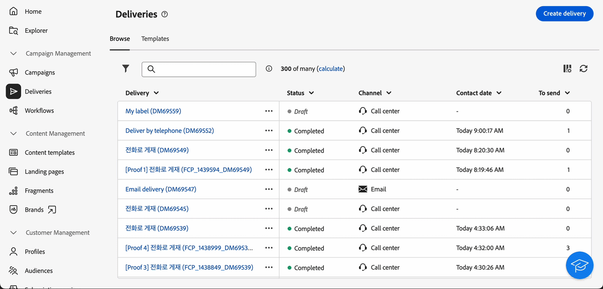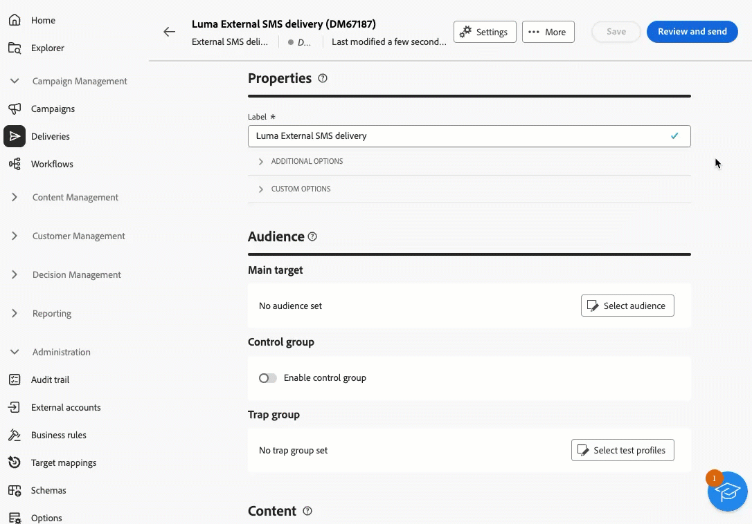 U kunt nu externe leveringen en externe leveringssjablonen definiëren in de webinterface van Campagne. In deze modus worden berichten gecompileerd naar een uitvoerbestand dat kan worden gedeeld met uw externe provider. Standaard wordt de externe leveringsmodus gebruikt voor het directe-mailkanaal.