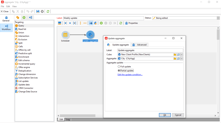 Als u een aggregaat wilt bijwerken, bewerkt u de Update aggregate -activiteit en selecteert u de kubus en het aggregaat die u wilt bijwerken.