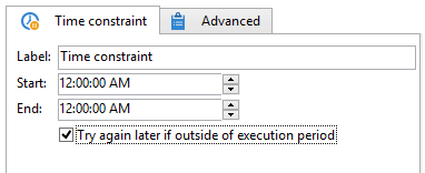 Wanneer de optie Try again later if outside of execution period is geselecteerd, kunt u de taak opnieuw buiten het uitvoeringstijdkader starten. Schakel deze optie uit als u wilt dat de workflowactie na de schorsing goed wordt beƫindigd.