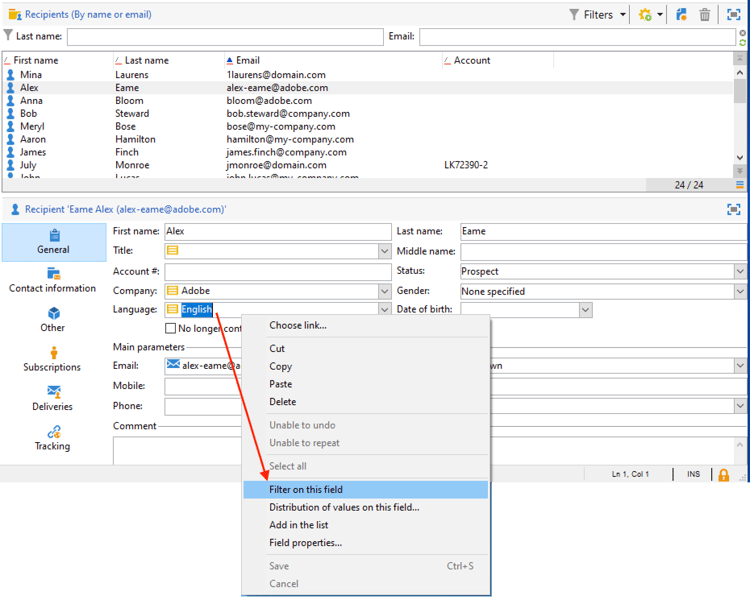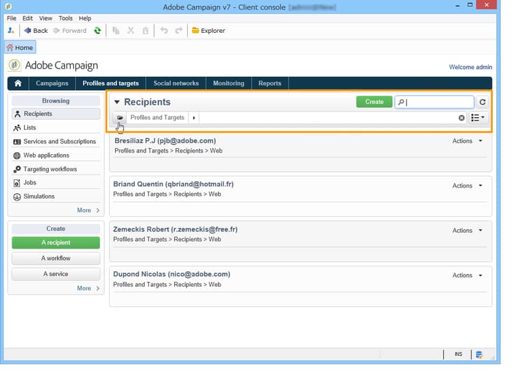 Standaard geeft Adobe Campaign alle databaserecords weer die de operator mag lezen. U kunt deze gegevens filteren met de opties in de bovenste sectie van het browservenster.