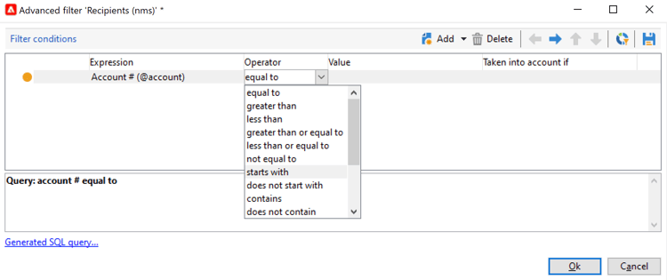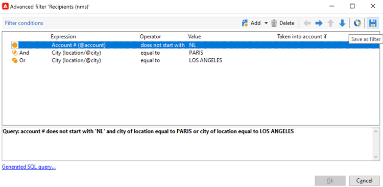 Definieer de filtervoorwaarden. In het onderstaande voorbeeld filtert u op ontvangers waarvan het accountnummer niet begint met NL en die in Parijs of Los Angeles wonen.