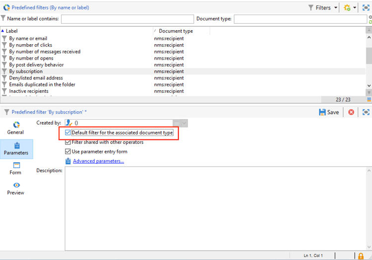 Klik op de tab Parameters en selecteer Default filter for the associated document type .