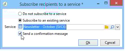 Als u alle geïmporteerde ontvangers wilt abonneren op een informatieservice, klikt u op de koppeling Edit… in de sectie Subscribe recipients to a service om de informatieservice te selecteren of te maken waarop de ontvangers zich moeten abonneren. U kunt de optie Send a confirmation message selecteren: de inhoud van dit bericht wordt gedefinieerd in de leveringssjabloon die is gekoppeld aan de abonnementenservice.