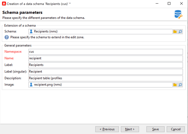 code language-none <srcSchema created="YYYY-MM-DD" desc="Recipient table" extendedSchema="nms:recipient" img="nms:recipient.png" label="Recipients" labelSingular="Recipient" lastModified="YYYY-MM-DD" mappingType="sql" name="recipient" namespace="cus" xtkschema="xtk:srcSchema"> <element desc="Recipient table" img="nms:recipient.png" label="Recipients" labelSingular="Recipient" name="recipient"> <attribute label="Member since" name="MembershipYear" type="long"/> <attribute length="50" name="lastName"/> <attribute _operation="delete" name="birthDate"/> </element> </srcSchema> -