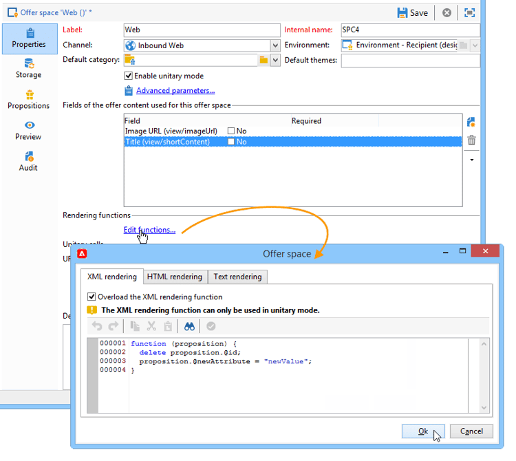 Ga naar de tab XML rendering en voeg de gewenste functie in.
