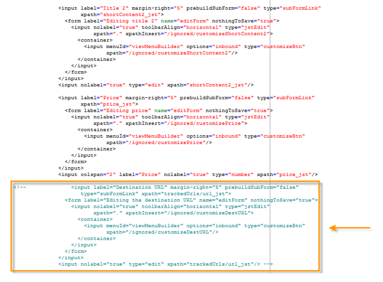code language-none <input label="Title 2" margin-right="5" prebuildSubForm="false" type="subFormLink" xpath="title2_jst"> <form label="Edit title 2" name="editForm" nothingToSave="true"> <input nolabel="true" toolbarAlign="horizontal" type="jstEdit" xpath="." xpathInsert="/ignored/customizeTitle2"> <container> <input menuId="viewMenuBuilder" options="inbound" type="customizeBtn" xpath="/ignored/customizeTitle2"/> </container> </input> </form> </input> <input nolabel="true" type="edit" xpath="title2_jst"/> <input label="Price" margin-right="5" prebuildSubForm="false" type="subFormLink" xpath="price_jst"> <form label="Edit price" name="editForm" nothingToSave="true"> <input nolabel="true" toolbarAlign="horizontal" type="jstEdit" xpath="." xpathInsert="/ignored/customizePrice"> <container> <input menuId="viewMenuBuilder" options="inbound" type="customizeBtn" xpath="/ignored/customizePrice"/> </container> </input> </form> </input> <input colspan="2" label="Prix" nolabel="true" type="number" xpath="price_jst"/>Opmerking toevoegen aan het doel-URL-veld: