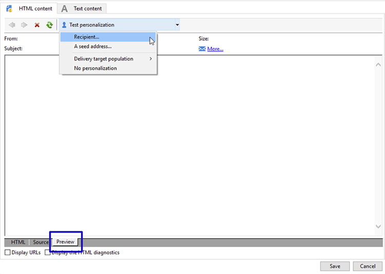 Voer een test uit om de naam te bevestigen die u aan de coupon hebt toegewezen. Ga naar de tab Preview en klik op Test personalization . Kies een ontvanger voor de test.