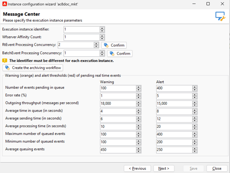 - Maximum number of queued events: maximumaantal gebeurtenissen aanwezig in de wachtrij van het Berichtencentrum op een bepaald moment.