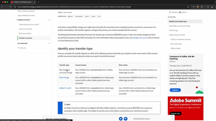 Voor dit type overschrijving hebt u een Adobe ID nodig die is gekoppeld aan de bestaande Commerce-account. Vervolgens wijzigt u die account in het e-mailadres voor de nieuwe eigenaar.
