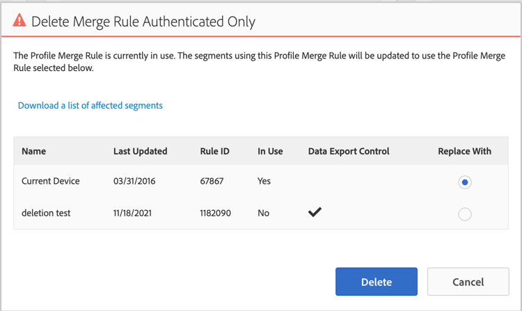Als u problemen of conflicten tegenkomt die proberen om PMR bij te werken, is het hoogstwaarschijnlijk toe te schrijven aan de segmenten in bijlage & de bijbehorende controles van de gegevensuitvoer. In dit geval, adviseren wij het creëren van net-nieuwe PMR (bereik aan de steunteams om een nieuwe regel te verstrekken als u bij de grens bent): https://experienceleague.adobe.com/docs/audience-manager/user-guide/features/profile-merge-rules/merge-rules-start.html?lang=nl-NL#profile-merge-rule-setup