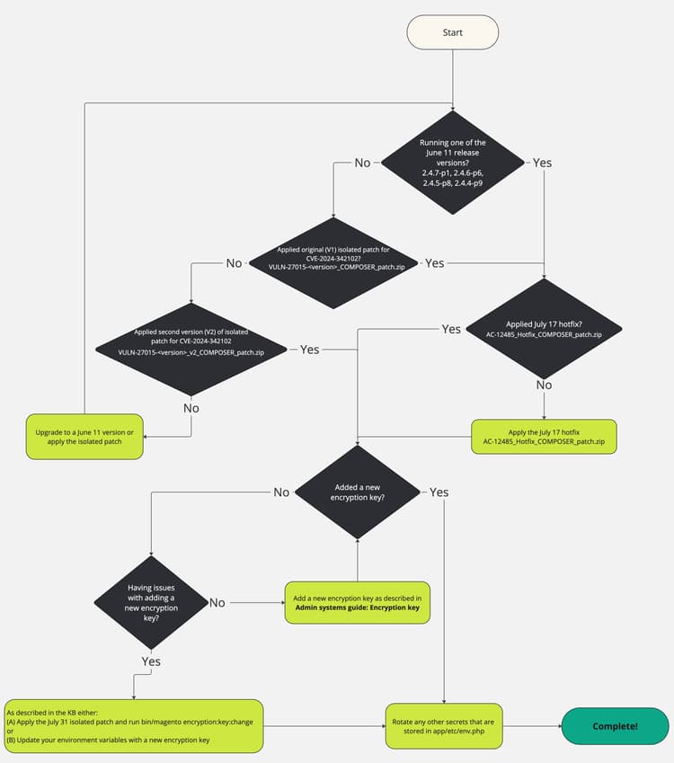 Om de stappen te illustreren die eerder zijn meegedeeld en hierboven zijn samengevat, om tegen CVE-2024-34102, evenals de extra hieronder gevonden het oplossen van problemen te beschermen, kunt u dit stroomdiagram ook gebruiken: