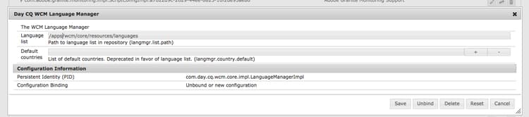 Bepaal de plaats en klik {de Manager van de Taal van 0} Dag CQ WCM , en verander de waarde van Lijst van de Taal aan