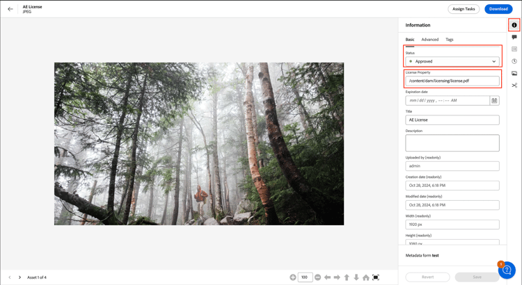 Als beheerder kunt u het metagegevensformulier bewerken en het veld voor de elementlicentie opnemen, zodat het in de AEM-auteursomgeving wordt weergegeven in de eigenschappen Asset. Vervolgens kunt u het element goedkeuren, evenals de licentie om het middel onder licentie te geven en beschikbaar te maken op Content Hub.