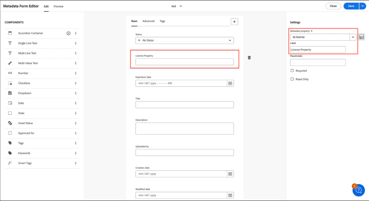 - Bewerk het metagegevensformulier om een nieuw tekstveld op te nemen waarin de licentiegegevens worden opgenomen. Wijs het tekstveld toe aan de eigenschap