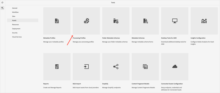 Klik de sectie van Hulpmiddelen van de linkernavigatiebar en klik Assets en klik dan Profielen van de Verwerking.