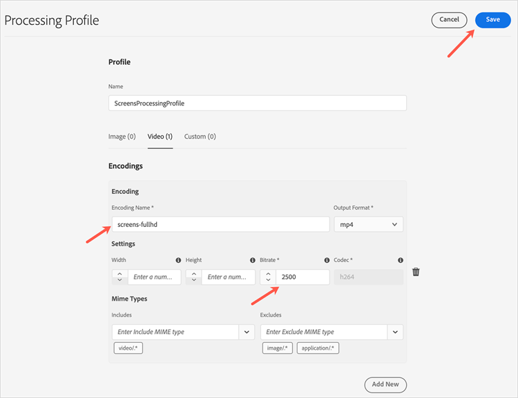 note important IMPORTANT Gebruik de coderingsnaam die begint met "screens-". Alleen deze video-uitvoeringen worden beschouwd als het afspelen van de video-ervaring in Screens as a Cloud Service. Voer de bitsnelheid in die voor uw video's wordt gebruikt (2500 kbps voor video van 720 pixels en 5000 kbps voor video van 1080 px). note note NOTE U kunt meerdere video-uitvoeringen met verschillende breedte/hoogte/bitsnelheid toevoegen om uw video's te kunnen bewerken. Alle schermen, vertoningen worden gedownload door de apparaten van Screens, alhoewel het apparaat slechts videovertoning speelt. -