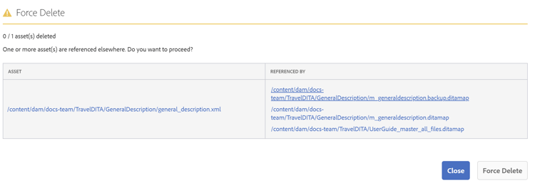 In een omgeving voor meerdere toepassingen is het ook belangrijk ervoor te zorgen dat gebruikers geen bestanden van het systeem verwijderen. Deze vereiste is belangrijker voor bestanden die door andere gebruikers zijn uitgecheckt. AEM Guides biedt een configuratie die u kunt gebruiken om te voorkomen dat uitgecheckte bestanden per ongeluk door gebruikers worden verwijderd. Naast uitgecheckte bestanden kunt u ook het verwijderen van bestanden besturen die verwijzingen bevatten of waarnaar wordt verwezen vanuit andere bestanden.