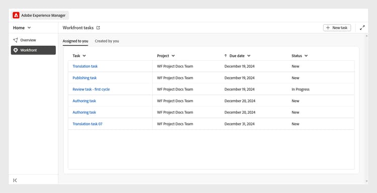 De integratie voorziet u ook van de capaciteit om uw het werkrijen te controleren, die u ervoor zorgen georganiseerd en bovenop al uw taken (toegewezen taken) blijven. Ook kunnen projectmanagers de kracht van Adobe Workfront benutten voor diepgaand projectbeheer in Experience Manager Guides.