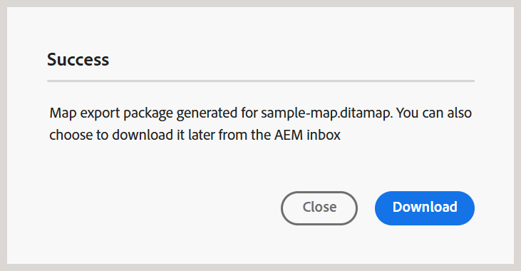 .zipformaat te downloaden. Of download deze later via het Postvak IN van AEM.note note NOTE Standaard blijven de gedownloade kaarten vijf dagen in het Adobe Experience Manager-berichtvenster Inbox staan.
