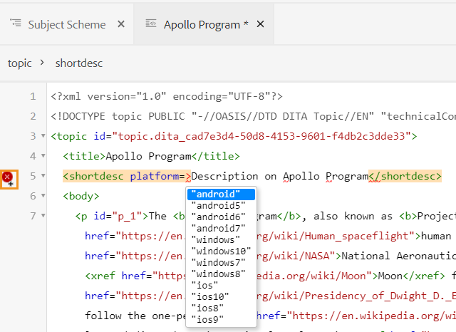 Gebruik bijvoorbeeld de volgende opsomming om het kenmerk @platform te beperken tot het element <shortdesc> . De andere voorwaarden zijn zichtbaar voor alle elementen.