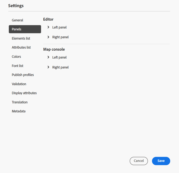 Panelen: Dit het plaatsen controleert de panelen die in de linker en juiste panelen van de Redacteur en de console van de Kaart worden getoond. U kunt de knop in- of uitschakelen om het gewenste deelvenster weer te geven of te verbergen.
