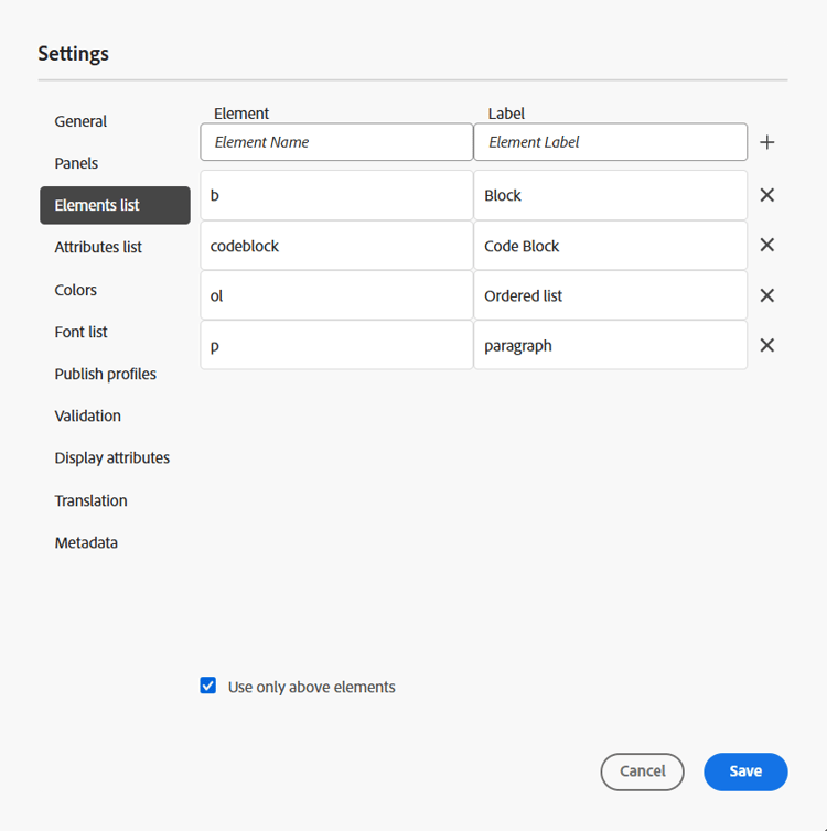 lijst van Elementen: Als beheerder, kunt u de lijst van elementen controleren die een auteur in een dossier kan opnemen en ook de vertoningsnaam voor het element bepalen. Met de instelling voor de Elements-lijst kunt u de naam van het element opgeven volgens de DITA-specificaties en een label dat u wilt gebruiken in plaats van de door DITA gedefinieerde elementnaam: