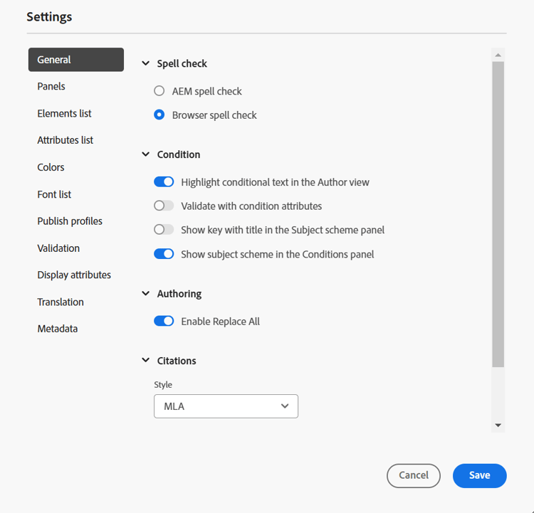 controle van de Spel: Er zijn twee opties - de spellingcontrole van AEM en Browser spellingcontrole. Standaard gebruikt de editor de functie voor spellingcontrole in de browser, waarbij de spellingcontrole wordt uitgevoerd met behulp van het ingebouwde woordenboek van de browser. U kunt overschakelen naar de spellingcontrole van AEM om het Adobe Experience Manager-woordenboek te gebruiken. Dit kan ook worden aangepast om uw aangepaste woordenlijst toe te voegen. Voor meer informatie over het aanpassen van het woordenboek van AEM, de mening past de sectie van het standaardwoordenboek van AEM in installeert en vormt Adobe Experience Manager Guides as a Cloud Service aan.