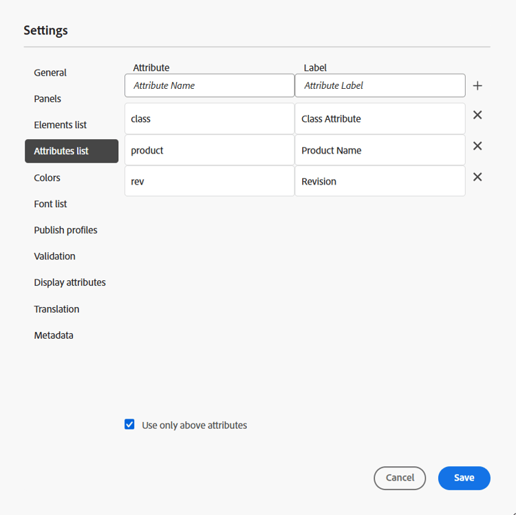 de attributen van de Vertoning: Als de lijst van Attributen, kunt u de lijst van attributen controleren die in de attributenlijst van een element moeten worden getoond. Door gebrek, zijn vier attributen van de Vertoning — publiek, platform, product, en steunen gevormd om in de attributenlijst van een element worden getoond. U kunt een vertoningsattribuut ook toevoegen gebruikend pictogram op de bovenkant toevoegen. U kunt om het even welke vertoningsattributen ook schrappen gebruikend het pictogram van de Schrapping.