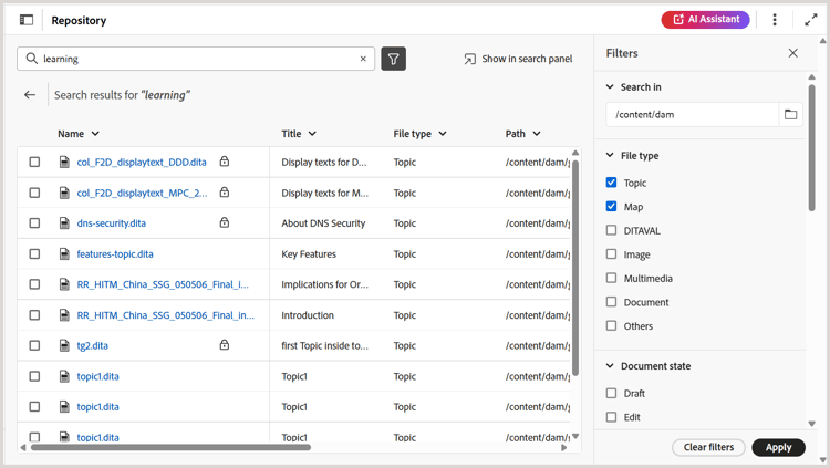 het type van Dossier: Filter uw onderzoek dat op een specifiek dossiertype wordt gebaseerd. Beschikbare opties zijn: Onderwerp, Kaart, DITAVAL, Beeld, Multimedia, Document, en anderen.