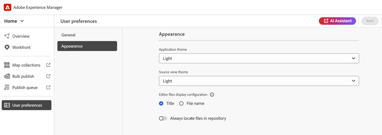 het thema van de Toepassing en de mening van Source: U kunt van de Lichte of Donkere thema's voor de toepassing en bronmening kiezen. In het geval van het thema Licht gebruiken de werkbalken en deelvensters een lichtgrijze achtergrond. In het geval van het thema Donker gebruiken de werkbalken en deelvensters een achtergrond met een zwarte kleur. Selecteer thema van het apparaat van 0} Gebruik {om Experience Manager Guides toe te staan om de lichte en donkere thema's te selecteren die op het thema van uw apparaat worden gebaseerd.