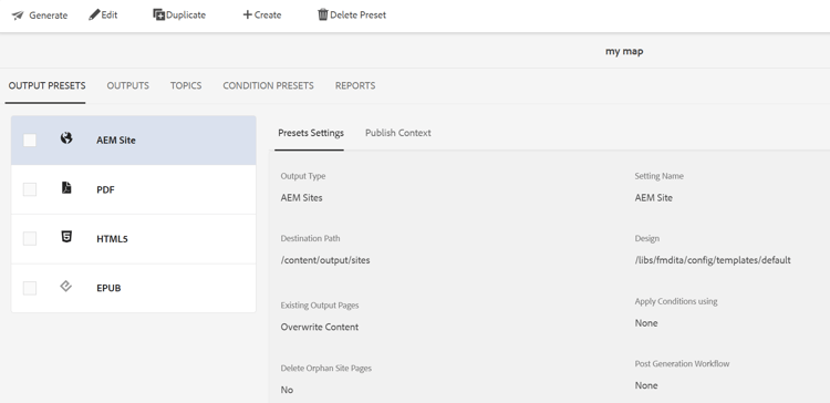 U kunt een uitvoervoorinstelling bewerken, dupliceren en verwijderen met behulp van het kaartdashboard door het vereiste tabblad in de bovenste balk te selecteren, zoals hieronder wordt weergegeven.