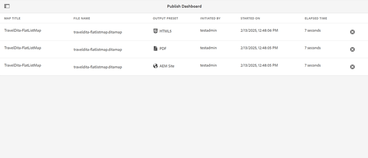Wanneer u een grote reeks het publiceren taken hebt die op uw systeem lopen, wordt het praktisch onmogelijk om elke kaart afzonderlijk te controleren DITA om zijn het publiceren taak te controleren. Adobe Experience Manager Guides geeft de beheerders en uitgevers één enkele mening van alle het publiceren taken die in het systeem lopen. Een lijst met alle actieve publicatietaken is beschikbaar op het dashboard Publiceren.