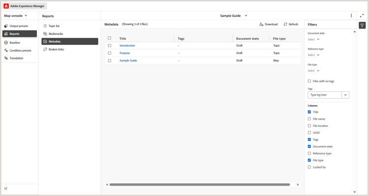 Adobe Experience Manager Guides wordt geleverd met een functie in de kaartconsole waarmee u de algehele integriteit van uw kaart kunt controleren en rapporten voor de kaart kunt genereren.