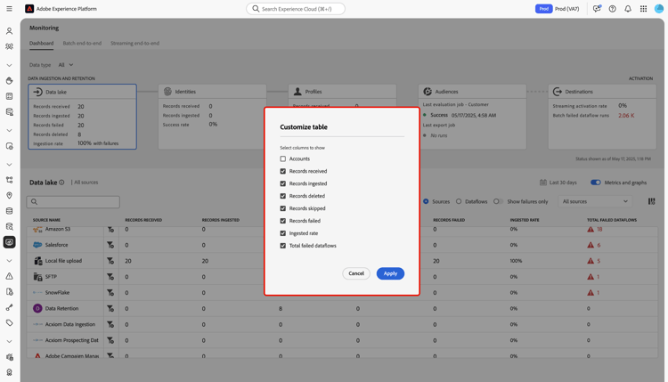 Gebruik vervolgens het venster Customize table om de kolommen te selecteren die u op het dashboard wilt weergeven. Selecteer Apply als u klaar bent.