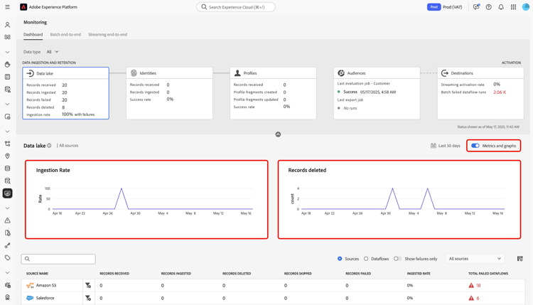 U kunt het controledashboard in de gebruikersinterface van Adobe Experience Platform gebruiken om metriek rond uw gegevensopname en gegevensbewaarnemings processen in gegevens meer terug te winnen. Gebruik de grafieken in de interface om inname- en retentietrends in de loop der tijd te controleren en de prestaties in al uw gegevensstromen van bronnen samen te vatten.