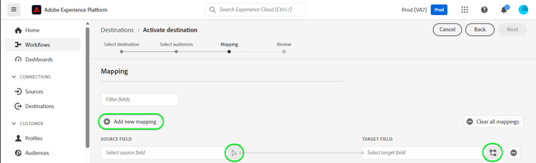 - Selecteer Add new mapping in de stap Mapping . U ziet nu een nieuwe toewijzingsrij op het scherm.