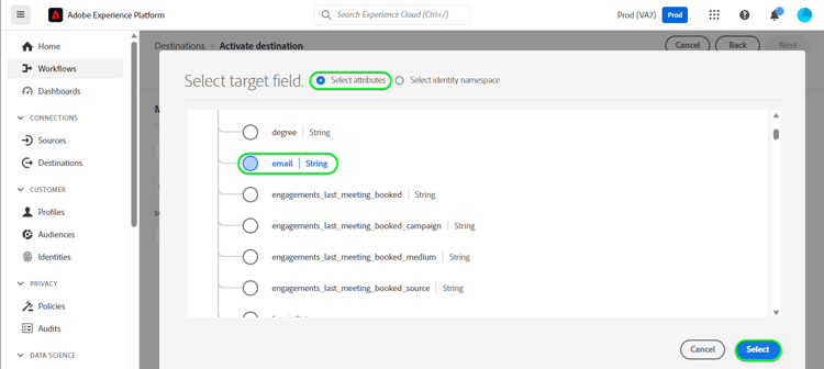 {het schermschot van 0} Experience Platform UI die Voornaam als doelattribuut selecteert.