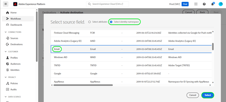 - Kies in het Select source field -venster de Select identity namespace en selecteer een identiteit.
