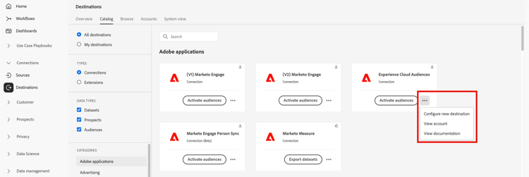 Op het tabblad Catalog wordt een lijst weergegeven met alle doelen die beschikbaar zijn in Experience Platform en waarnaar u gegevens kunt verzenden.