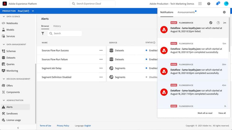 Met Adobe Experience Platform kunt u zich abonneren op waarschuwingen voor gebeurtenissen met betrekking tot Adobe Experience Platform-activiteiten. Het alarm vermindert of elimineert de behoefte om Observability Insights API te peilen om te controleren als een baan heeft voltooid, als een bepaalde mijlpaal binnen een werkschema is bereikt, of als om het even welke fouten zijn voorgekomen.