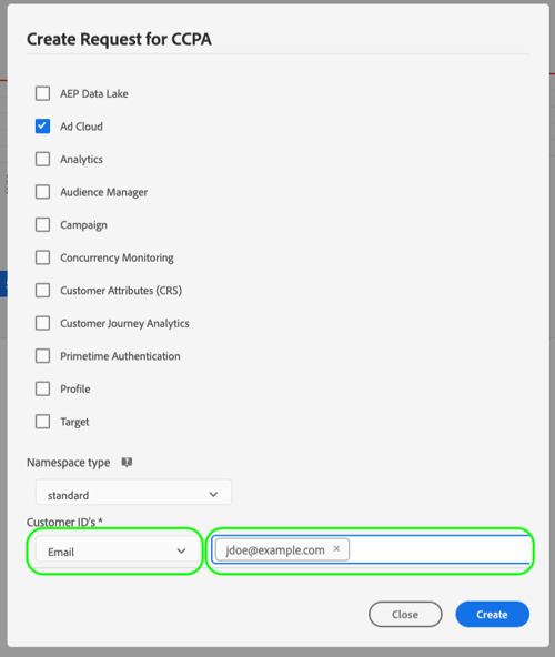 Wanneer het gebruiken van het standaard namespace type, selecteer een namespace van het drop-down menu (e-mail, ECID, of STEUN), dan typ de waarden van identiteitskaart in textbox aan het recht, drukkend \ <enter> voor elke identiteitskaart om het aan de lijst toe te voegen.