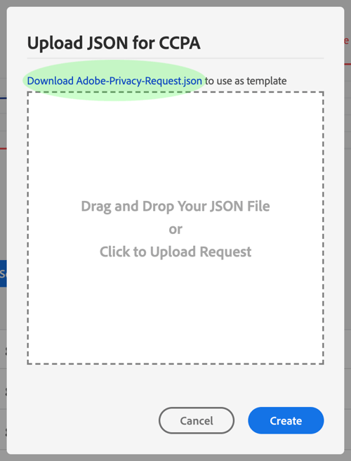 Als u geen JSON-bestand hebt om te uploaden, selecteert u Download Adobe-GDPR-Request.json om een sjabloon te downloaden die u kunt vullen op basis van de waarden die u van de betrokkenen hebt verzameld.