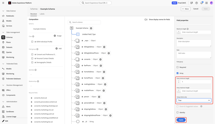 Nadat u het veld hebt geconfigureerd, selecteert u Apply om de wijziging toe te passen op het schema.