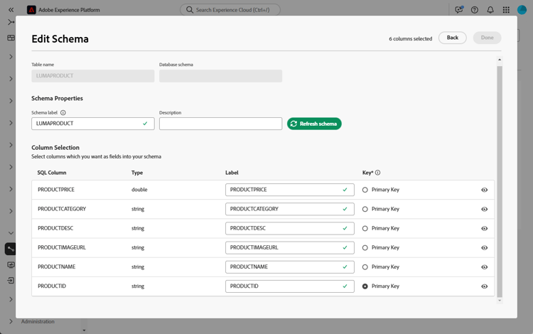 Tabellen in een gefederaliseerde database kunnen worden bijgewerkt, toegevoegd of verwijderd. In dergelijke gevallen moet u het schema in Adobe Experience Platform vernieuwen om het uit te lijnen met de meest recente wijzigingen. Om dit uit te voeren, selecteer het
