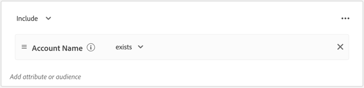Om ervoor te zorgen dat alleen accounts met een niet-lege accountnaam worden opgenomen, voegt u het attribuut Account Name toe en selecteert u existsals voorwaarde voor overeenkomst.