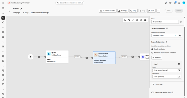 De Reconciliation -activiteit is een Targeting -activiteit waarmee u de koppeling kunt definiëren tussen de gegevens in Adobe Journey Optimizer en de gegevens in een werktabel, bijvoorbeeld gegevens die uit een extern bestand zijn geladen.