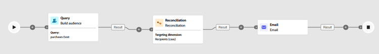 In dit voorbeeld wordt de Reconciliation -activiteit in Adobe Journey Optimizer gebruikt om ervoor te zorgen dat e-mails alleen naar herkende klanten worden verzonden. De gegevens lopen door een Read Audience -activiteit die gericht is op gebruikers met eerdere bestellingen. De Reconciliation -activiteit komt deze inkomende gegevens vervolgens overeen met de bestaande profielen in de database via het e-mailveld.