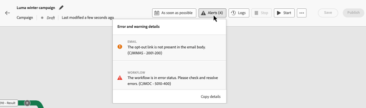 U kunt ontbroken activiteiten ook snel identificeren gebruikend de visuele statusindicatoren die direct op elke activiteit worden getoond. Voor gedetailleerde het oplossen van problemen, open de logboeken van de campagne , die diepgaande informatie over de fout en zijn context verstrekken.