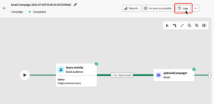 Het controleren van logboeken en taken is een zeer belangrijke stap om uw Geordende campagnes te analyseren en ervoor te zorgen zij behoorlijk lopen. Logbestanden en taken zijn toegankelijk via de knop Logs , die beschikbaar is in zowel de test- als de live modus op de canvaswerkbalk.